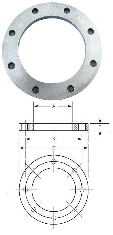 | (Inches) | (mm) | Pipe OD | Part Number (Galvanised) | Part Number (SS316) | K | D | A | T | S | No. of Bolt Holes | Bolt Size |
